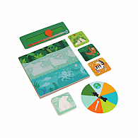 20 Animal cards, 5 Danger cards, 5 Reward cards, 1 Environment gameboard, 1 sliding thermometer, 1 game spinner