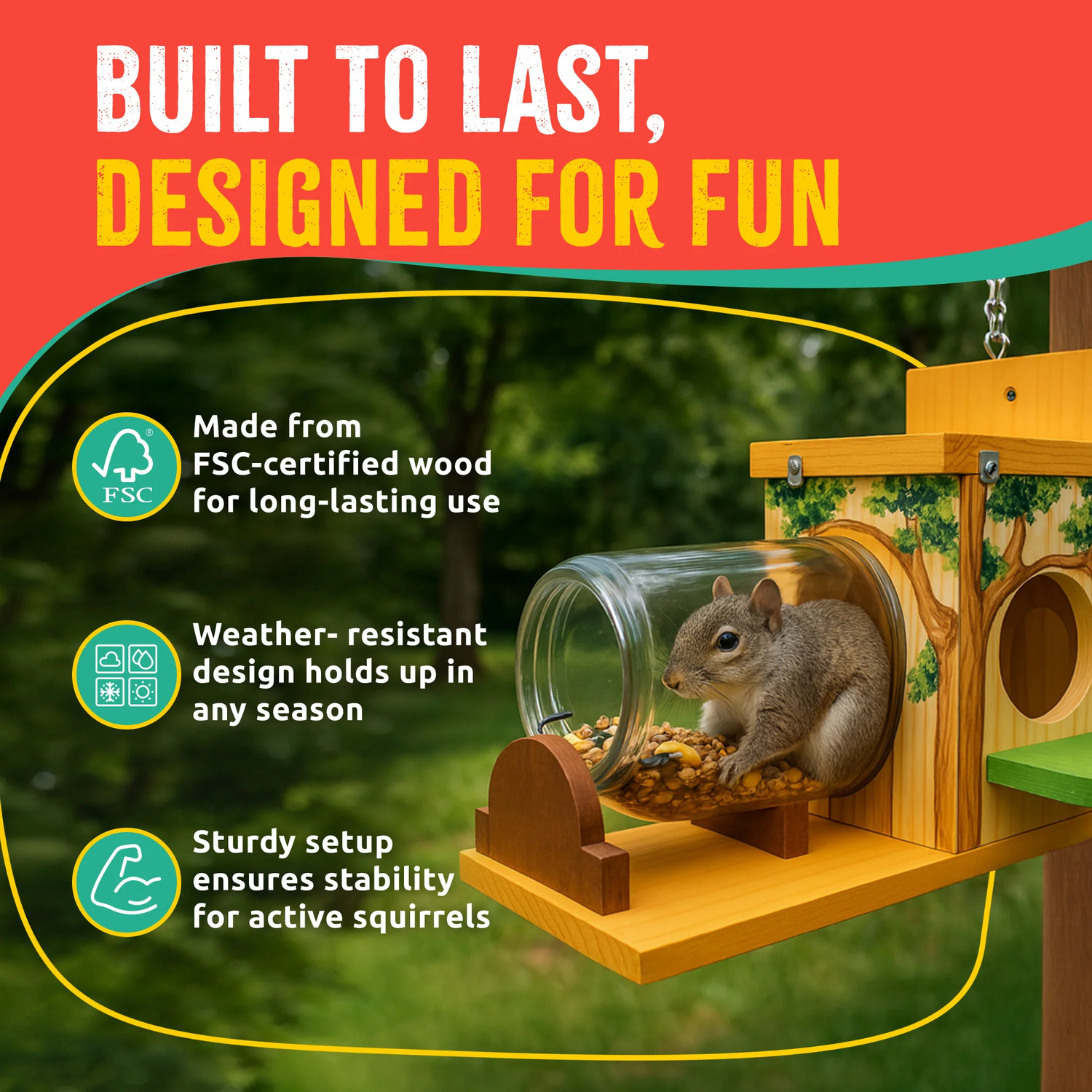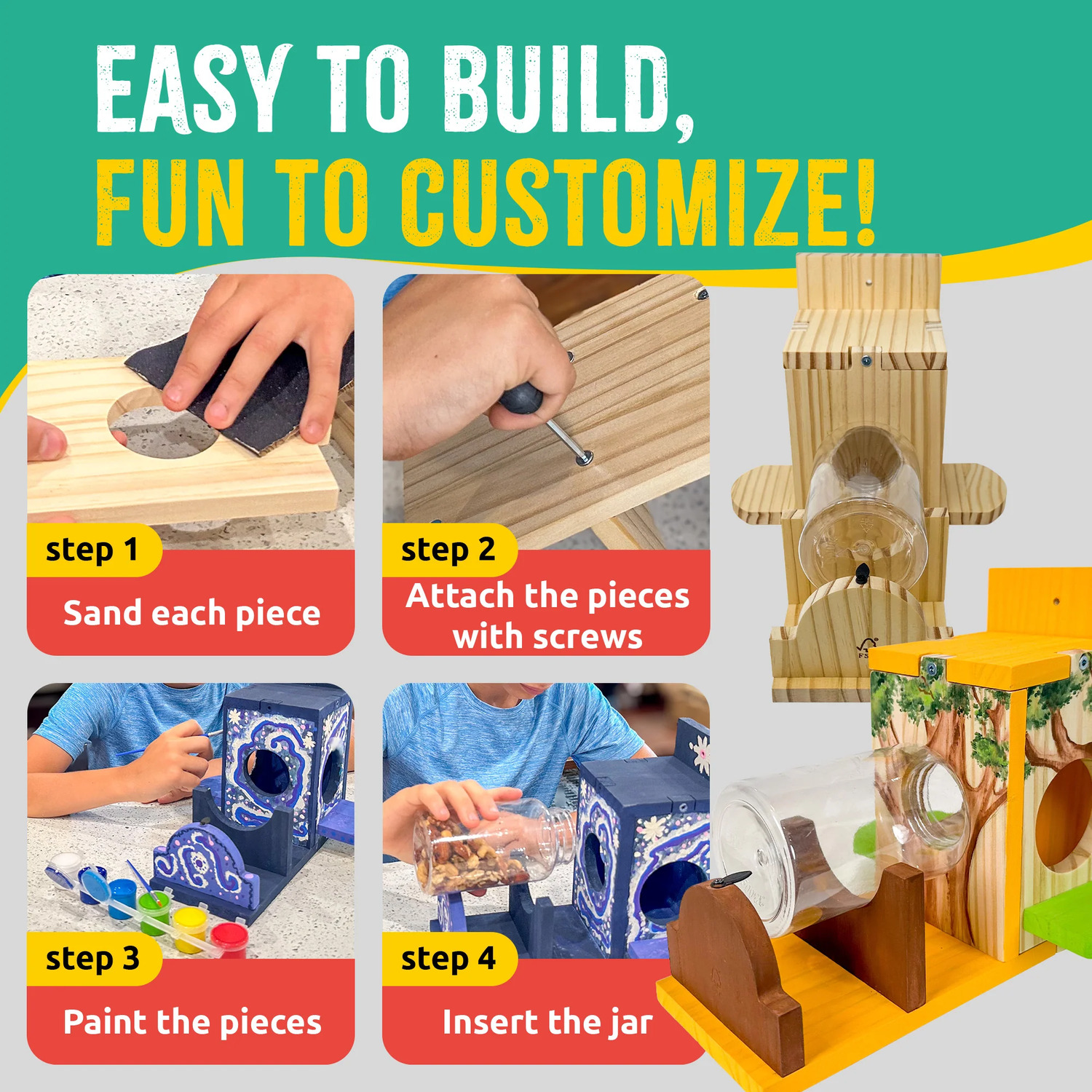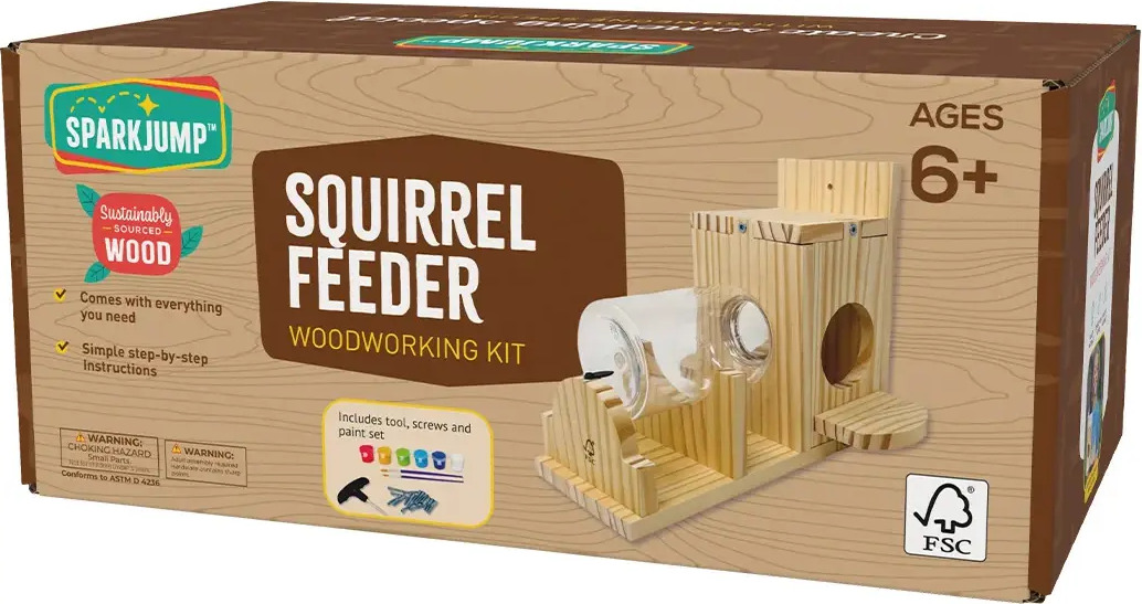 Our SparkJump Squirrel Feeder Woodworking Kit comes with 100% FSC-certified New Zealand Pine, screws, a kid-friendly tool, sandpaper, and a 6-color paint set for endless creativity!