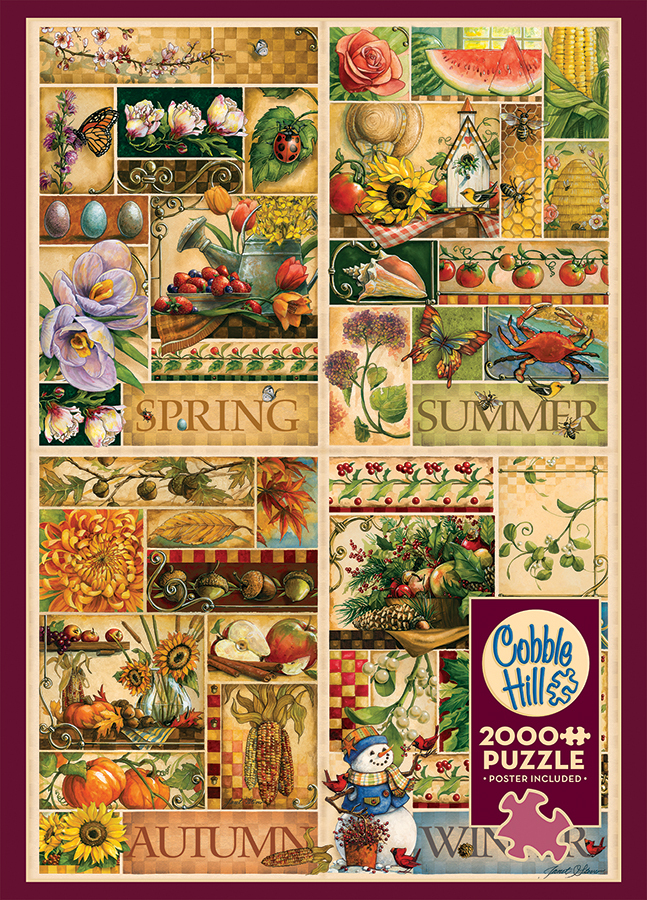 The Four Seasons are celebrated in this nostalgic 2000 piece puzzle by artist Janet Stever. This lovely puzzle reminds us of fresh cut flowers from the garden and a cornucopia of delicious fresh fruit.