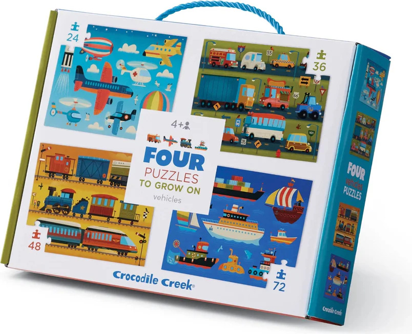 Build skills and confidence with this fun progressive puzzle set featuring exciting vehicles! The Crocodile Creek Four Puzzles to Grow On set includes four beautifully illustrated puzzles that increase in difficulty, allowing children to advance their puzzling skills step by step.