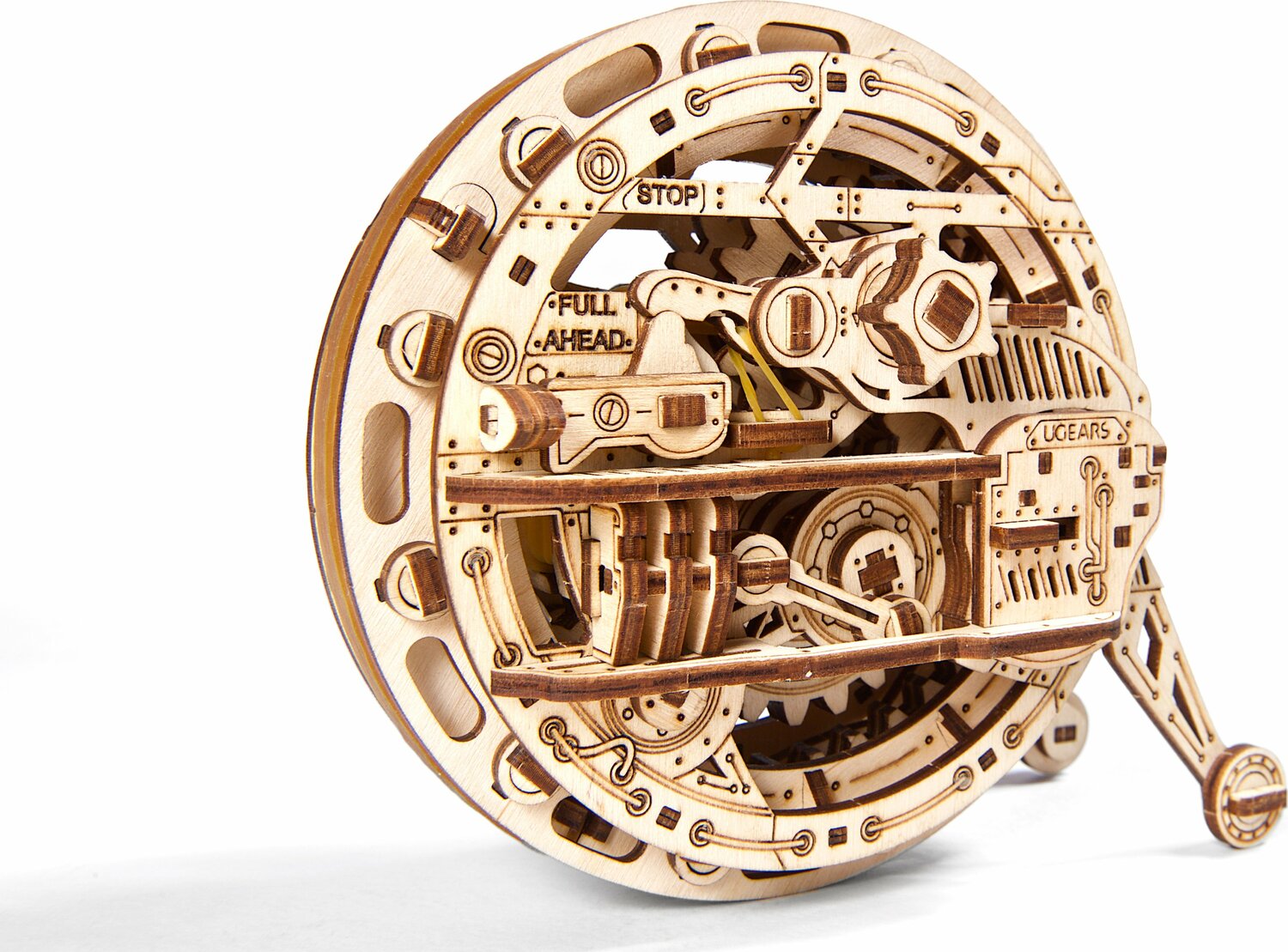 We hope you have missed unusual and peculiar mechanical models, because here comes the Monowheel rolling in to join your Ugears collection. Browsing through old photo archives we stumbled upon an image of a fun and smart transport device invented in the beginning of the 20th century. This was a single wheel accommodating one passenger-driver who looked so pleased with himself sitting inside his curious device that we couldnat help but design one for our collection. We extended our research to find out more about single-wheel mechanisms and found ones that had no operator at all, developed as war machines and all covered in armor. What really inspired us was a similar approach to the transmission employed in all the prototypes starting in the 1860s: a moving outer element with a stationary mechanism inside. Our peaceful minds striving for creation and curiosity took the best of those two prototypes and today we proudly present the all-wooden mechanical Monowheel! No armor shell included a" your new Monowheel is built in skeleton steampunk style, which means you can see and enjoy the beauty of moving gears. Despite its airy delicate appearance, your new model is quite sturdy a" you can take it outside and give it a good roll around on the pavement and other hard and semi-hard surfaces. The parts of the mechanism imitate a real steam engine. The lack of an outer shell grants easy access to rubber bands should you need to replace them. Two working modes guarantee even more fun. Mode one with the feet locked will give you uninterrupted rolling straight ahead for about 1.5 a" 2 meters (5.0-6.6 ft) until the rubber-band motoras resource is completely released. After that the model gracefully turns around and stops. The second mode with the feet in the unlocked position your Monowheel will roll ahead while the rubber-band motor is working. After that it turns around, its feet hide inside and the model keeps rolling until it runs into an obstacle. In this mode, the model can cover up to 5 meters, which inspired us to play some mechanical bowling using our new model as a bowling ball. We recommend this new sport to all our friends! As to the technical characteristics: the Ugears Monowheel kit comes with 300 parts, including 19 spare parts. The assembled model measures at 185 Ñ... 95 Ñ... 160 mm (7.3 x 3.7 x' 6.3' inches) and like all Ugears family models, itas made of sustainably sourced high grade wood and has everything you will need for assembly.' The quality of the parts is top-notch: a laser method is used for cutting items from a plywood board that provides precise hairline cuts. The details have to be pulled out of the boards and assembled to create a complete model. Like all other Ugears models, the Monowheel comes with step-by-step, full-color, truly easy to follow instructions in 11 languages (English, German, Ukrainian, French, Polish, Spanish, Russian, Japanese, Italian, Chinese and Korean) and requires neither glue nor special tools to be fully assembled into functional Monowheel. Let the fun roll in! Model Size: 7.3 x 3.7 x 6.3 in Package size: 14.6 x 6.7 x 1.3 in Number of parts: 300 Level: Intermediate Assembly Time: 3 hours Recommended Age: 14+ Kit weight: 1.69 lbs Case Pack Quantity: 5 Manufacturer: UGears